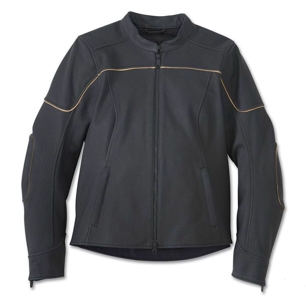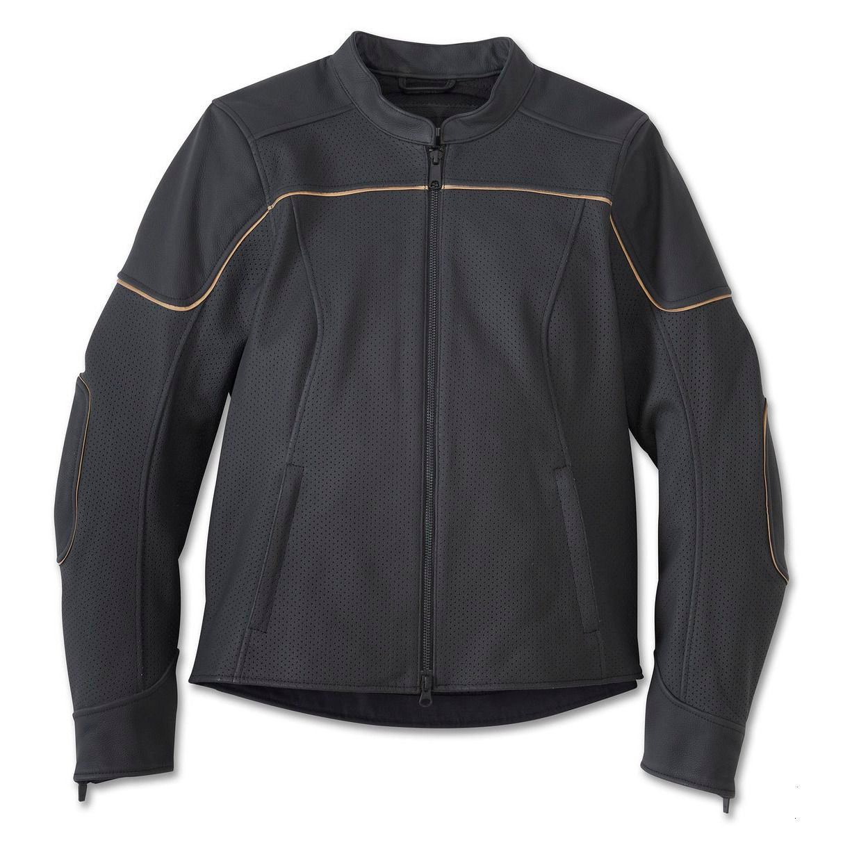 Cool cafe racer styling that feels cooler on the road is here on this Limited Edition. The Merit Perforated Leather Jacket is cut from Monaco leather that's perforated to improve airflow (zoom in to see). This women's motorcycle jacket also features ample pockets for securing essentials and a hit of reflective material to boost visibility. Its shape-flattering silhouette is finished with elbow patching plus contrasting trim and graphics for a timeless H-D look. For superior breathability and impact protection, equip it with our D3O Ghost Armor options. Then order ASAP since supplies are limited.